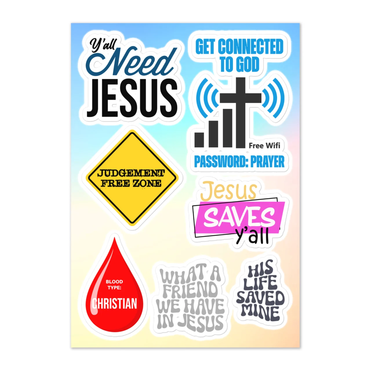 Funny Christian Evangelism Sticker Sheet – ‘Y’all Need Jesus’ ‘Judgement Free Zone’ ‘Jesus Saves Y’all’ – Outreach Faith Decals – Shareable Christian Sticker Pack
