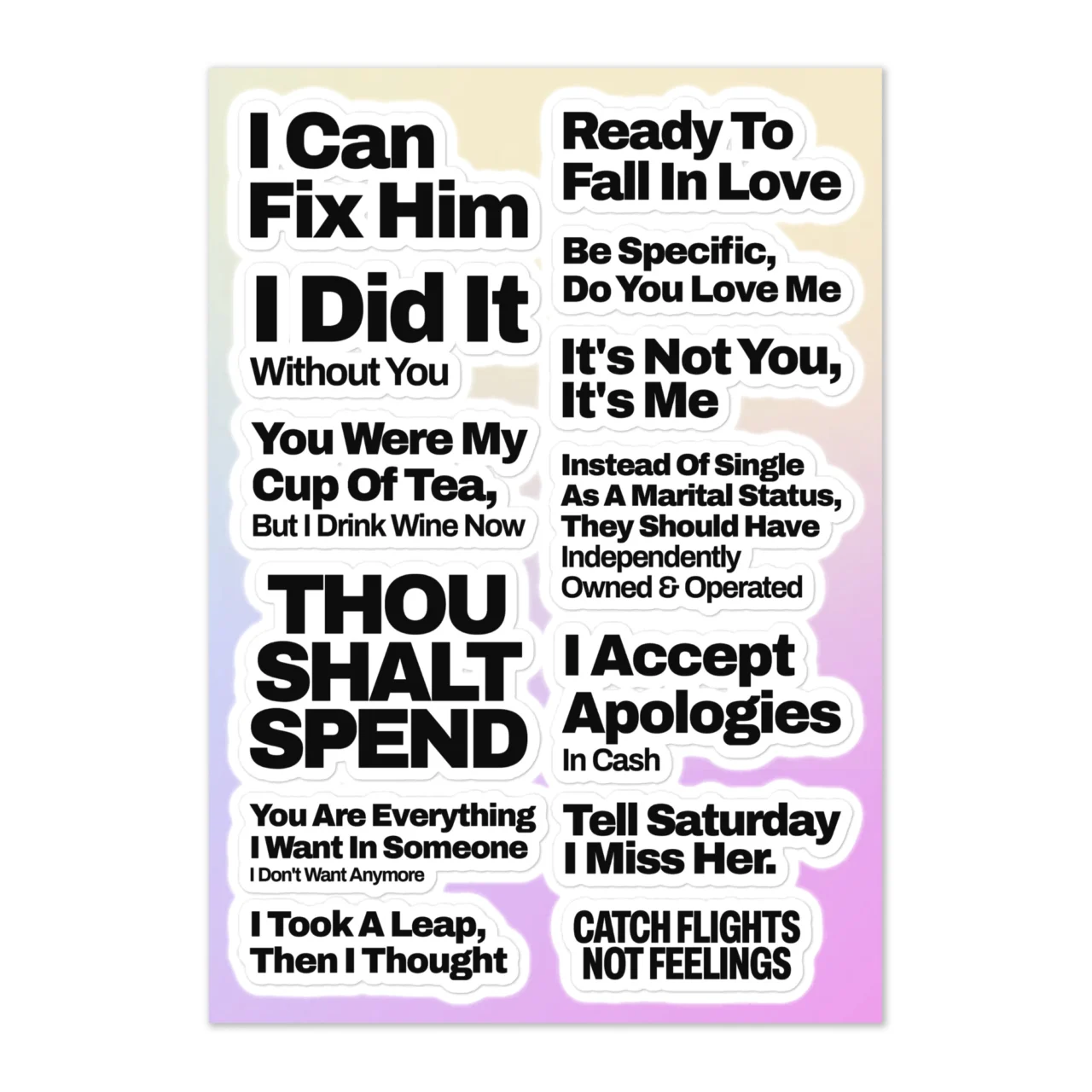 Heartbreak Sticker Sheet – Funny Dating & Breakup Humor Decals – ‘Catch Flights Not Feelings’ – ‘I Can Fix Him’ – Single Life Sticker Pack for Laptops & Planners