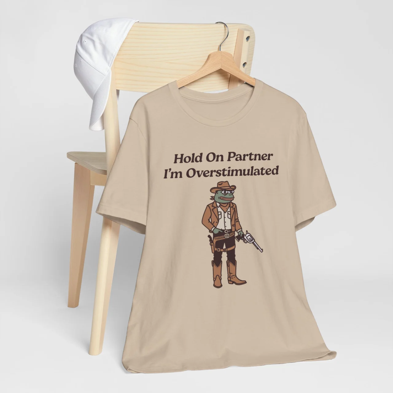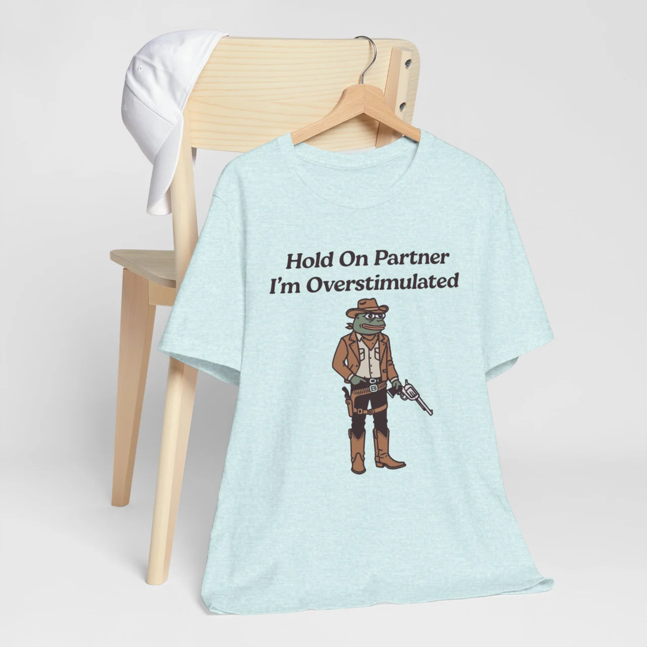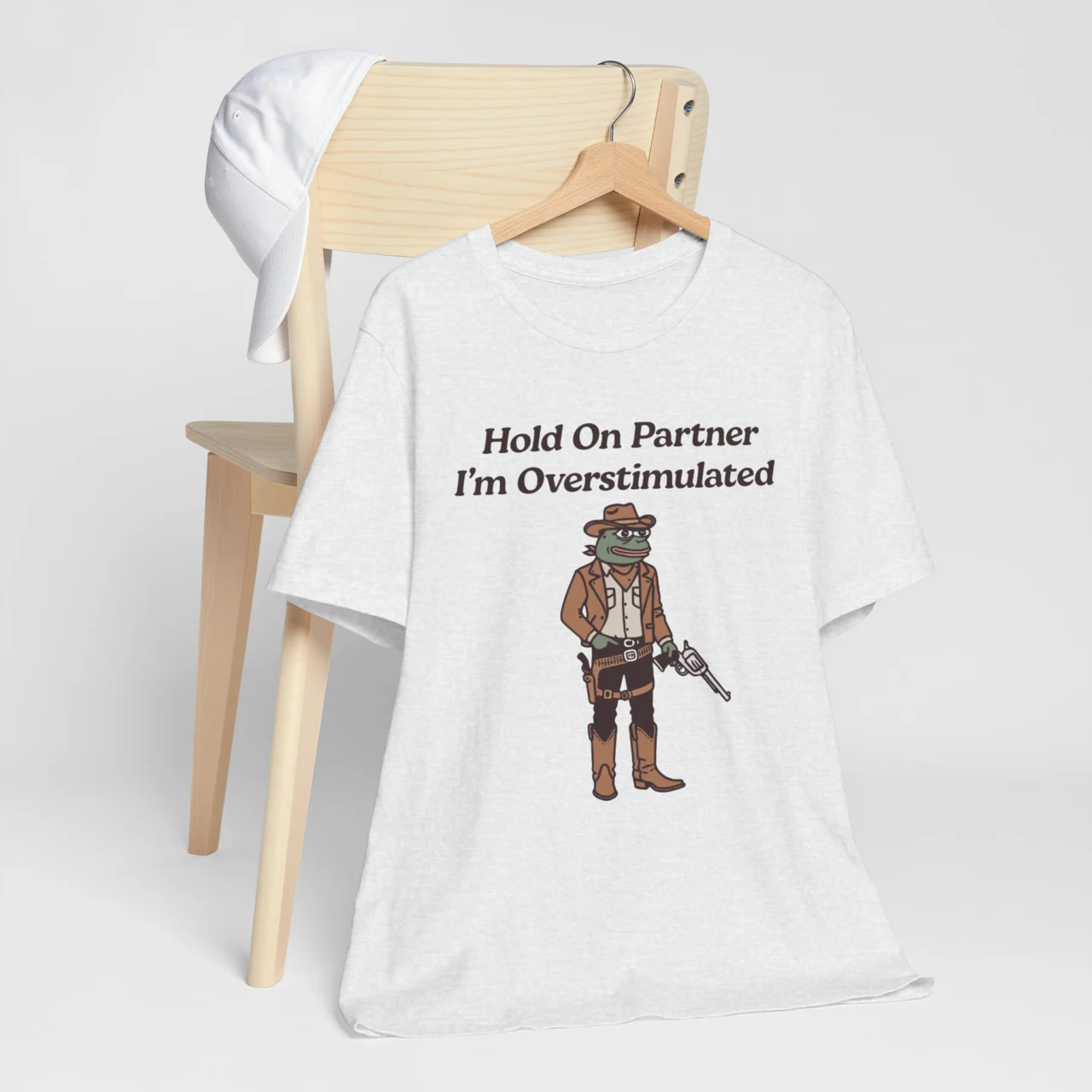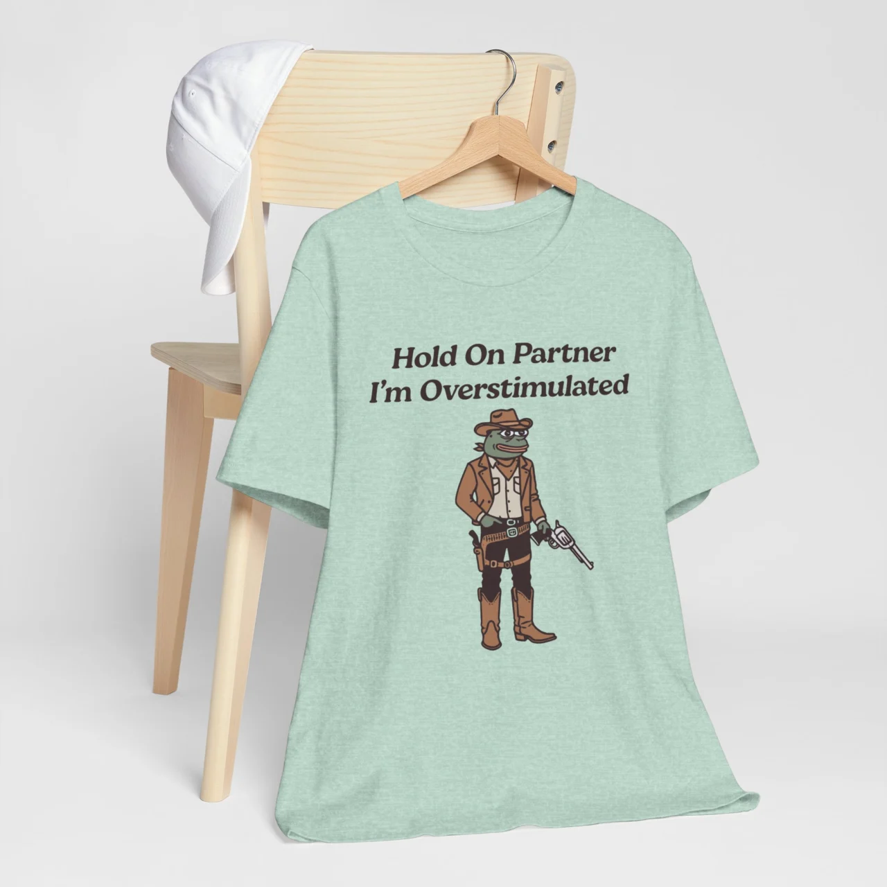 Yeehaw, but make it anxious. A quirky cowboy meme tee for those who need a moment before socializing. #Overstimulated #FrogMeme #CowboyAesthetic #FunnyWesternTee #QuirkyHumor