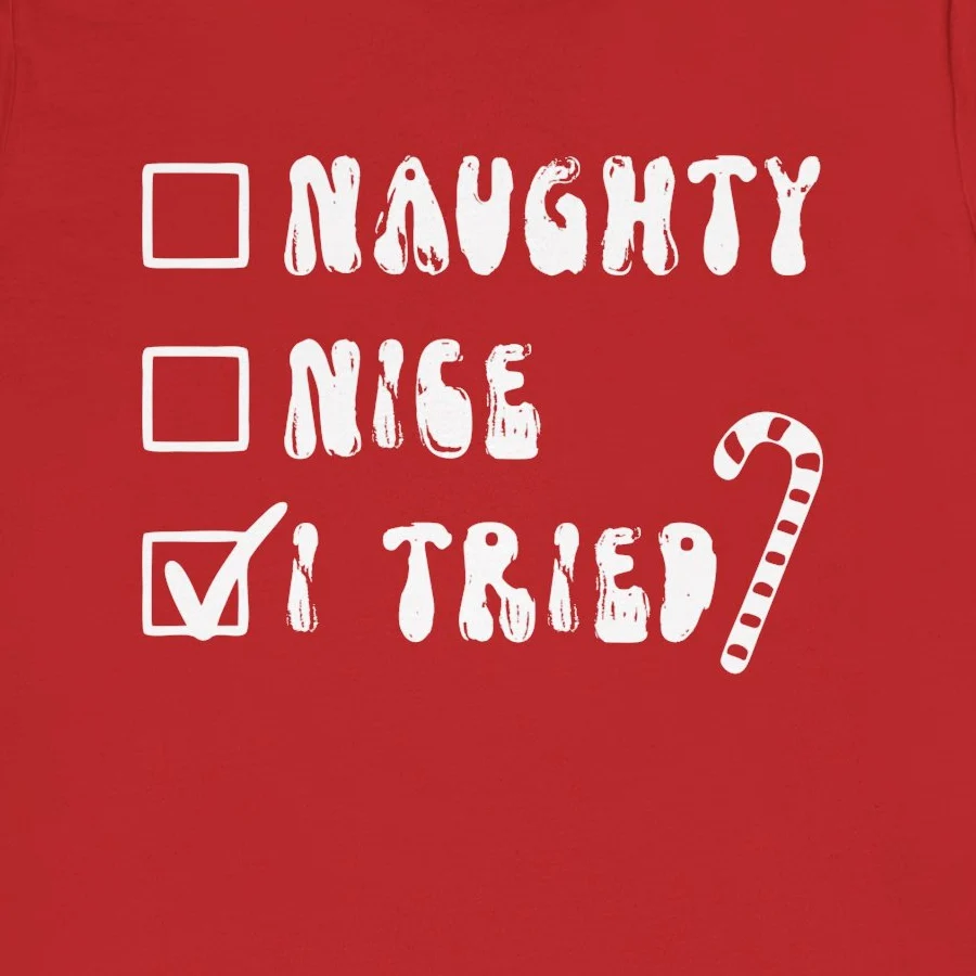 #NaughtyNiceITried #SarcasticChristmas #NaughtyListTee #FunnyChristmasTee #HolidayEffort #SantaChecklist #ITried