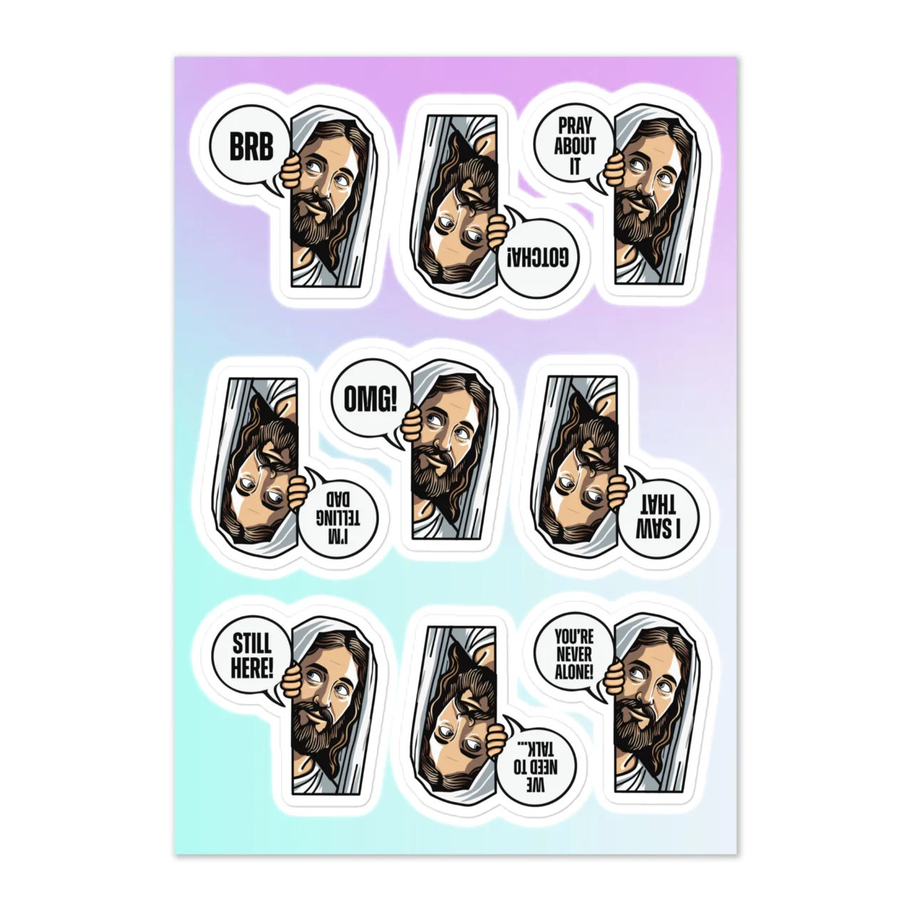 Jesus Peeking Sticker Sheet – ‘BRB’ ‘Pray About It’ ‘OMG’ ‘Still Here’ – Funny Jesus Watching Decals – Christian Youth Sticker Pack – Laptop Bible Phone Case Stickers