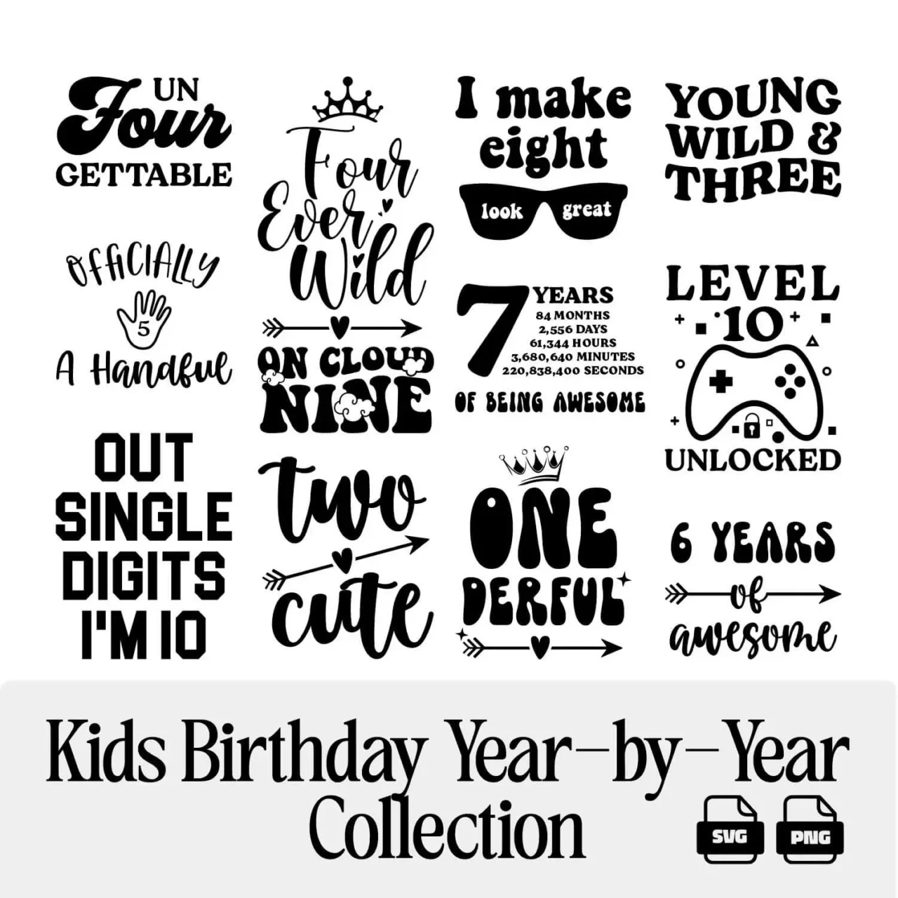 Every year is a milestone worth celebrating, and now you have the designs to make each one look amazing. The Kids Birthday SVG PNG Design Bundle Ages 1-10 gives you individual birthday designs for ages 1 through 10, each delivered as both an SVG file and a transparent PNG, ready to use in your party planning and personal craft projects.