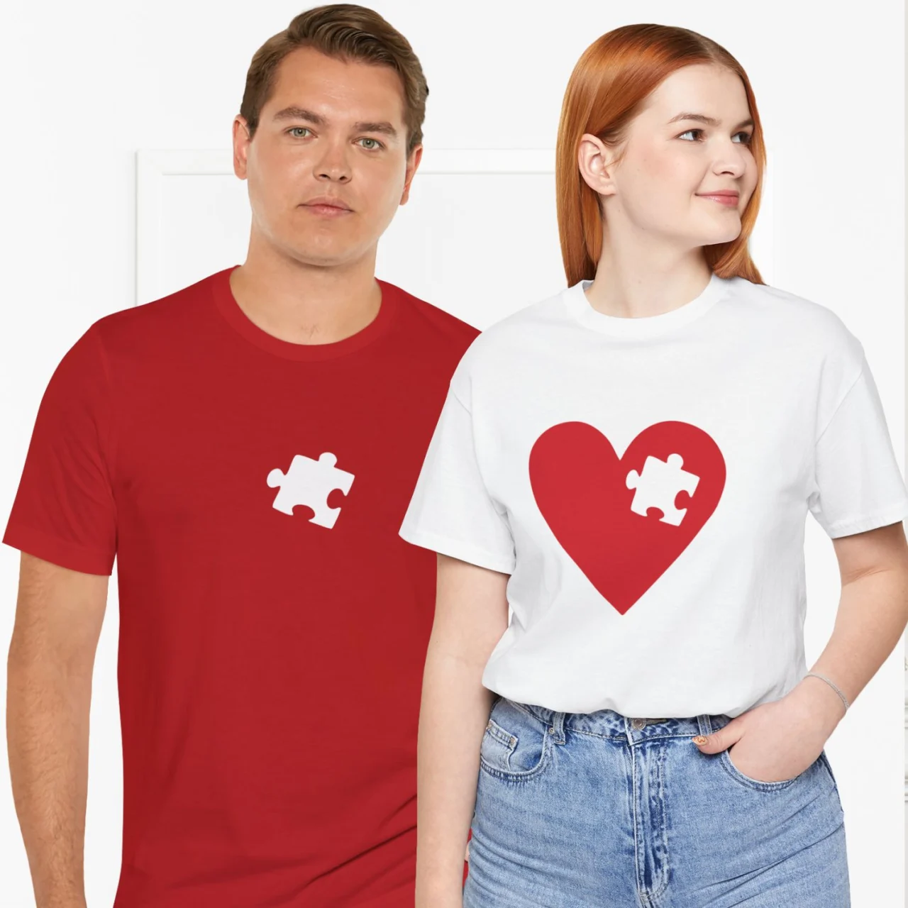 This Puzzle Piece Heart Gift set features a coordinated look that tells a story when you stand together. The man’s shirt is a vibrant red tee featuring a single, solid white puzzle piece over the heart. The woman’s shirt provides the perfect counterpart in a crisp white tee, featuring a large red heart with a puzzle-shaped cutout that exactly matches his piece. It is the essential Soulmate Relationship Apparel for anniversary photoshoots, romantic getaways, or cozy date nights.