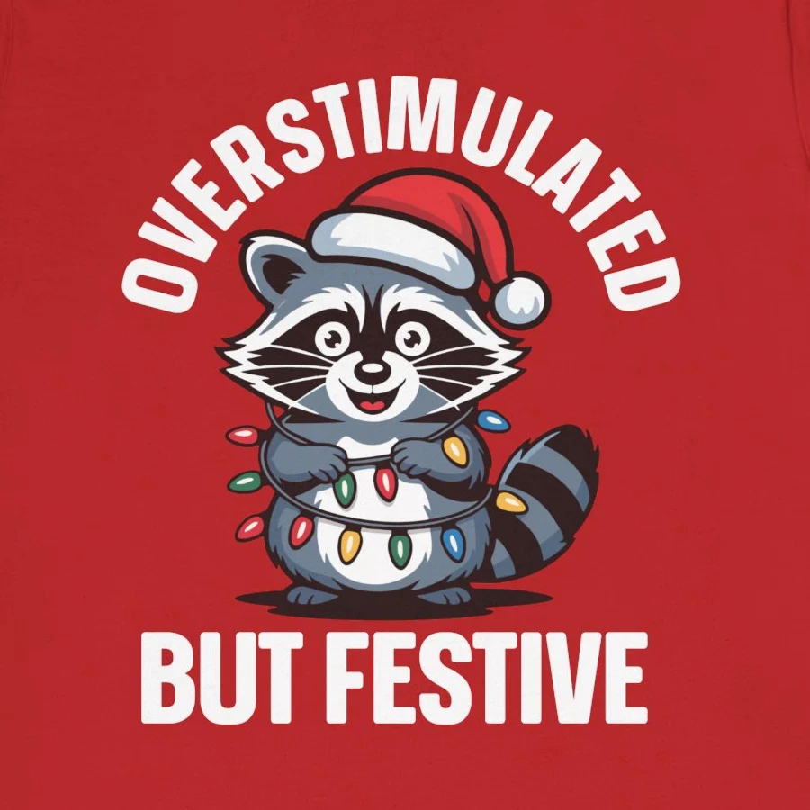 #OverstimulatedButFestive #RaccoonChristmas #IntrovertTee #ChristmasChaos #FunnyChristmasTee #HolidayHumor #RaccoonLover