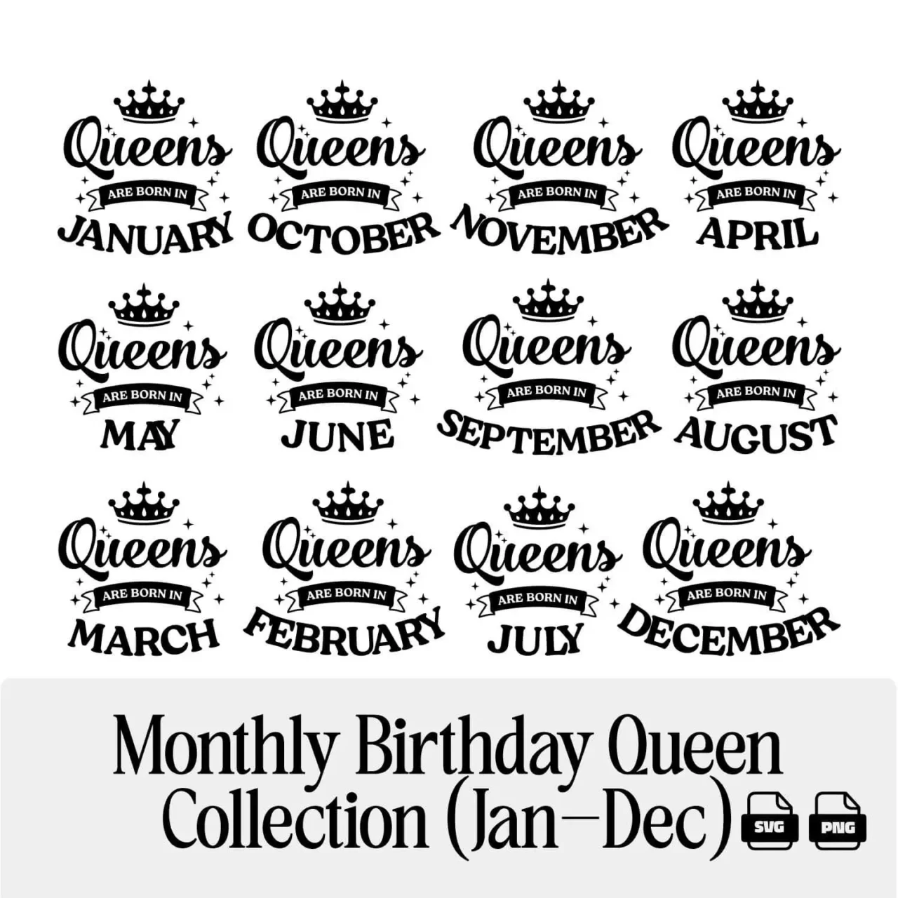 What’s Included: 12 individual monthly birthday queen designs, one for each month (January through December), each as an SVG and a transparent PNG file.