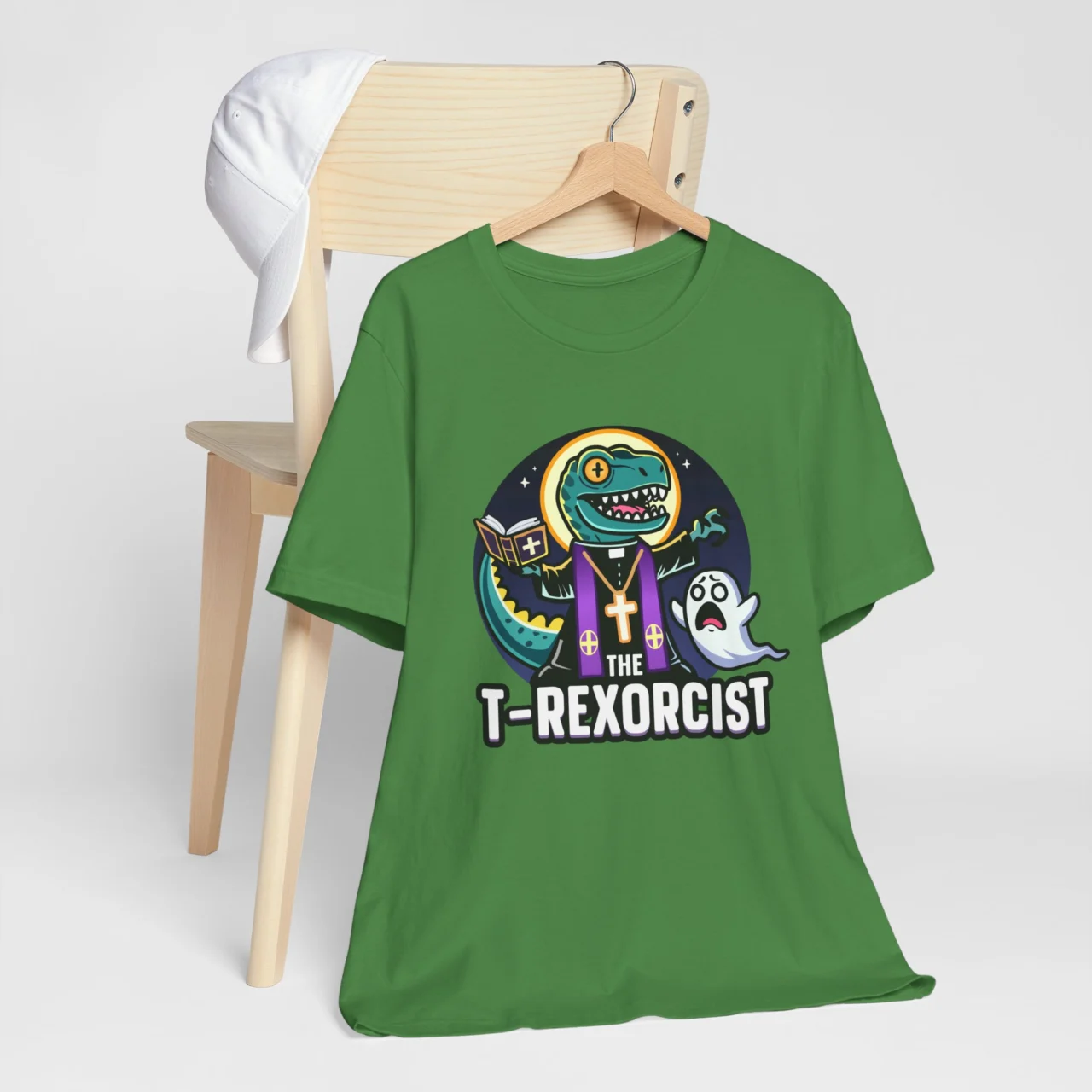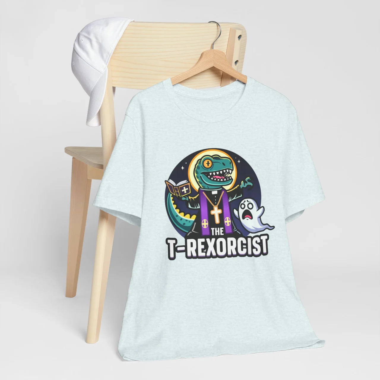 The T-Rexorcist Funny T-Shirt – Halloween T-Rex Priest Tee – Dino Humor Funny Unisex Short Sleeve Shirt