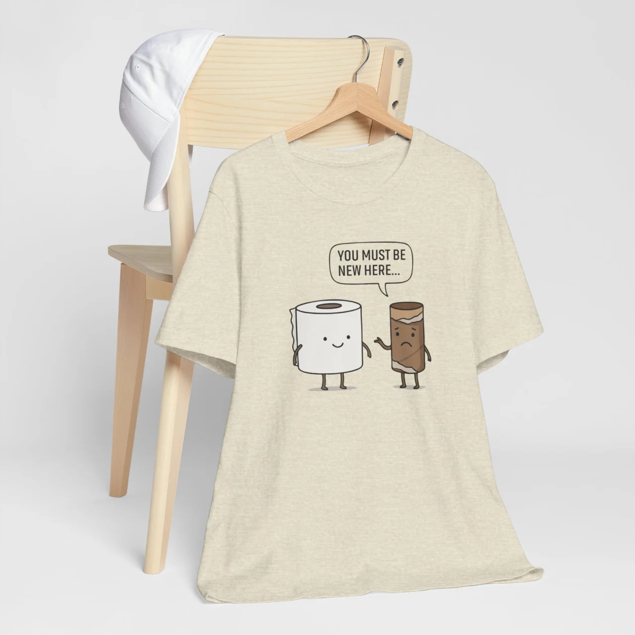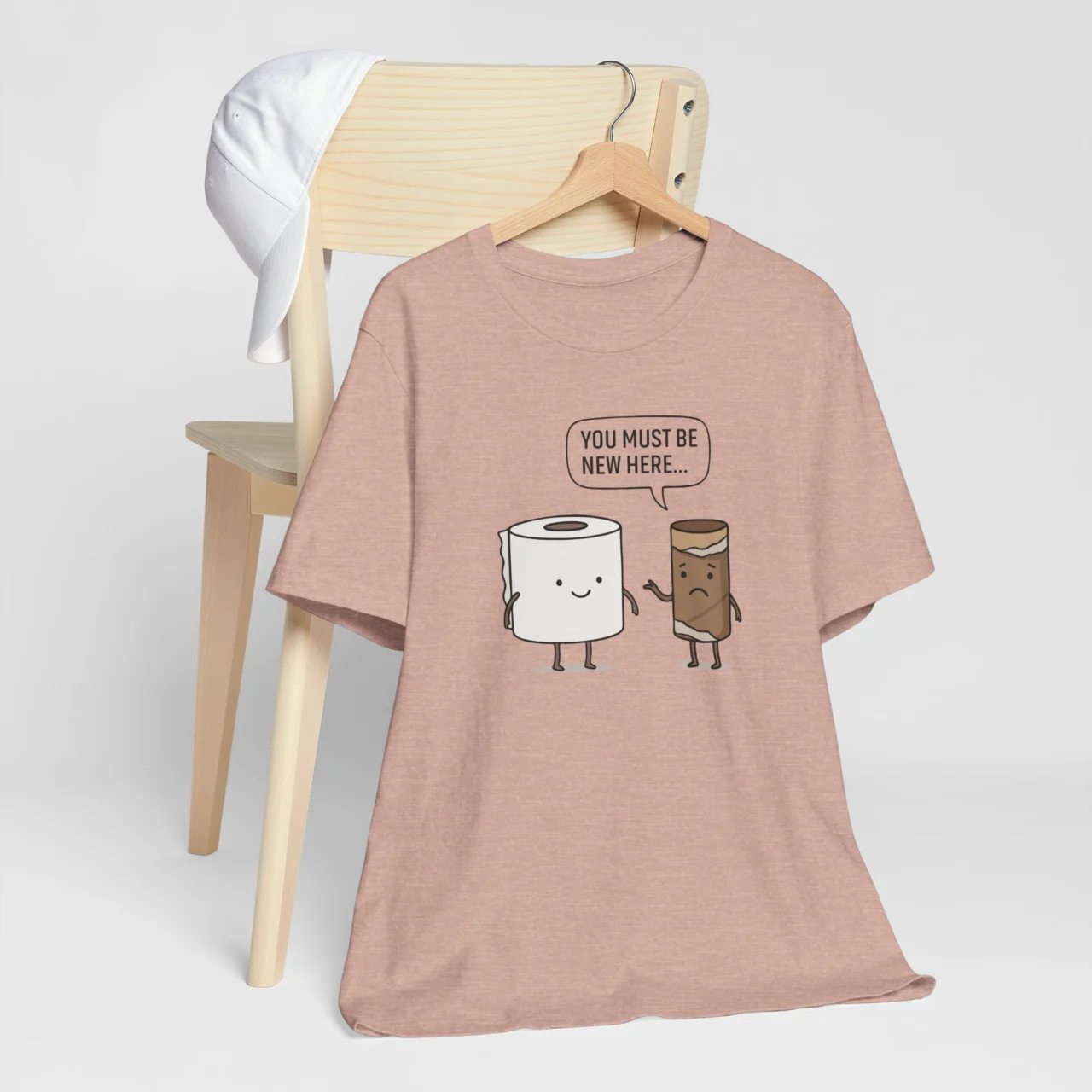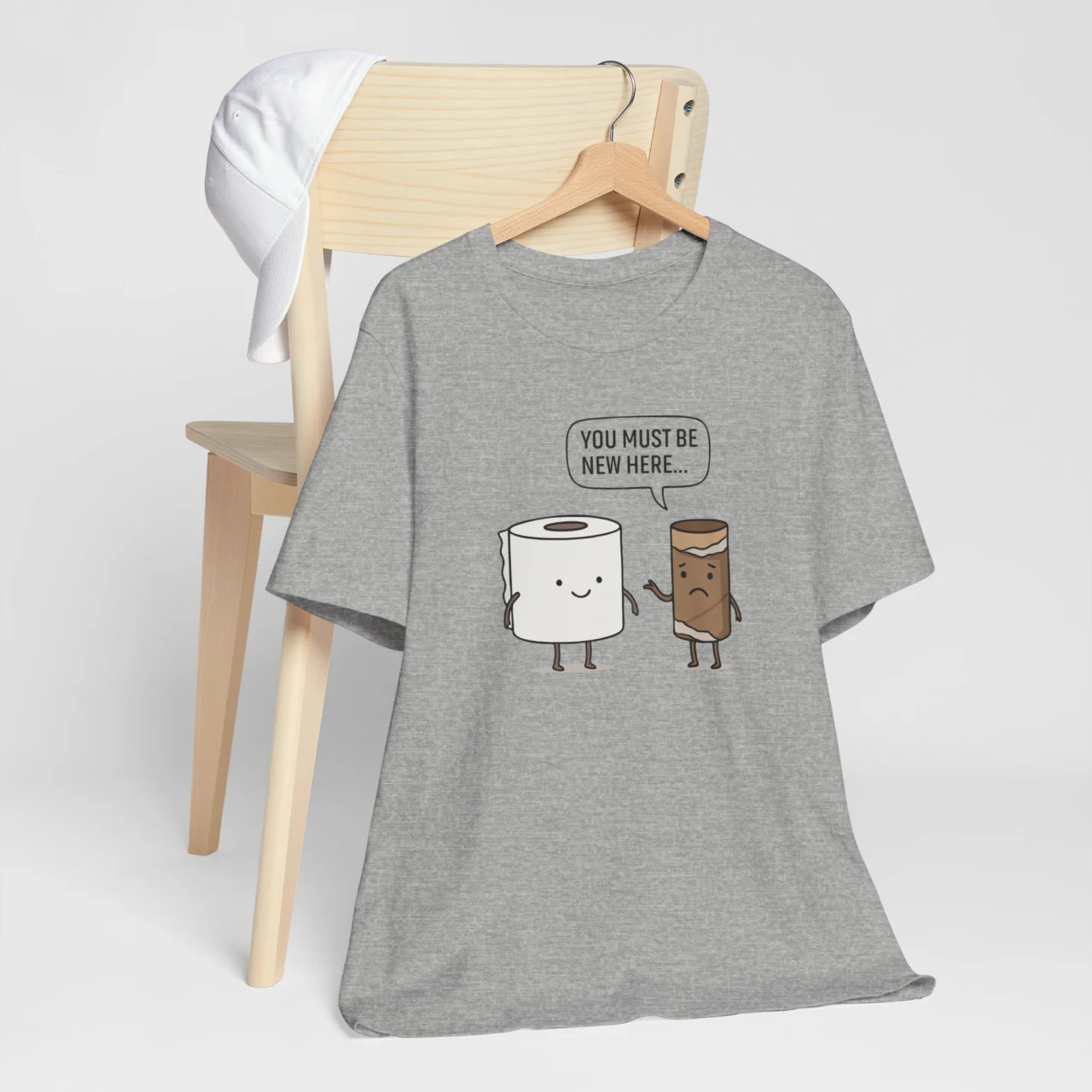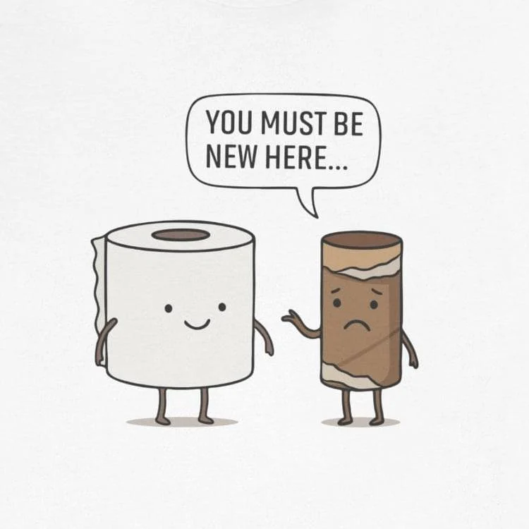 The You Must Be New Here t-shirt brings toilet humor to a whole new level, literally a conversation between an old roll and a fresh one. It’s witty, lighthearted, and the perfect shirt for people who don’t take life (or bathroom breaks) too seriously. Great as a gag gift, casual wear, or that one tee everyone at the office secretly wants.